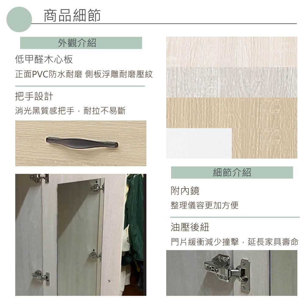 ◇全木心板正面PVC防水耐磨 側板木紋浮雕耐磨壓紋 ◇門片緩衝油壓鉸鍊 滾輪式滑軌 內附吊桿一支 內附鏡面 ◇表面木紋細緻搭配時尚冰島白橡(白橡、原切、原切白)色