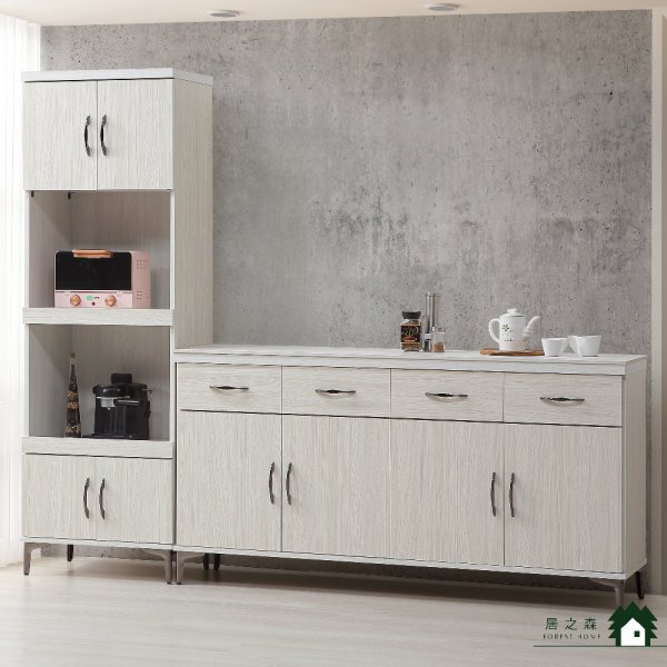◇木心板鋼刷耐磨板製成 美背處理 ◇槍黑色電鍍鐵腳 霧面款人造岩板 ◇油壓後鈕 鋼珠滑軌 ◇餐櫃下座附兩片活動隔板 ◇電器櫃附一片活動隔板 ◇表面木紋細緻搭配優雅白榆木色